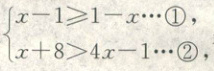 综合不等式$①$的解$x\geq1$和不等式$②$的解$x\lt3$,根据“大小小大中间找”的原则,不等式组$\begin{cases}x - 1\geq1 - x\\x + 8\gt4x-1\end{cases}$的解集为$1\leq x\lt3$。