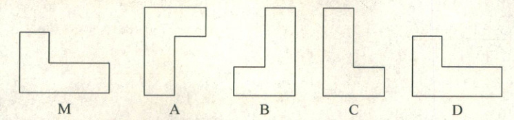 【解析】:平移不改变图形的形状、大小和方向,旋转不改变图形的形状和大小,但会改变方向。观察图形可知,图形M是一个左上角有缺口的L形。图形D与图形M的形状、大小和方向完全相同,可由平移得到;图形B和C可通过旋转图形M得到;而图形A的缺口在右上角,与图形M的方向不同,且无法通过一次平移或旋转得到。