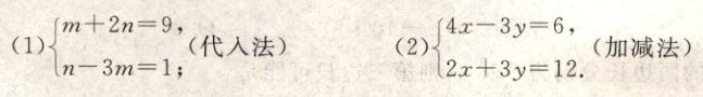 1. (1)用代入法解方程组$\begin{cases}m + 2n=9\\n−3m = 1\end{cases}$: