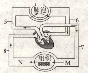 (3)在体循环中,血液流经组织细胞处的毛细血管(M处到N处)时,氧气和营养物质进入组织细胞,二氧化碳等废物进入血液,血液由含氧丰富的动脉血变成含氧较少的静脉血。