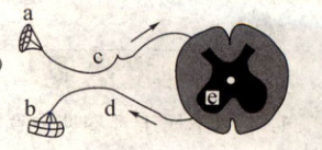 【解析】:反射弧包括感受器、传入神经、神经中枢、传出神经、效应器五部分。图中神经冲动的传导方向为:b→c→e→d→a,由此可判断:b是感受器,能接受刺激并产生神经冲动;c是传入神经,将神经冲动传至神经中枢;e是神经中枢,位于脊髓中央的灰质内,能接受神经冲动并产生新的神经冲动;d是传出神经,将来自神经中枢的神经冲动传至效应器;a是效应器,能接受神经冲动并作出反应。