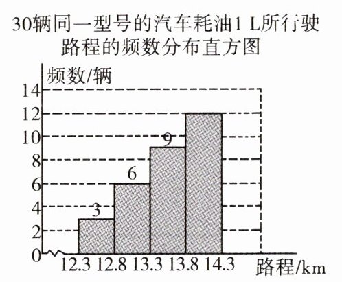 15. 在相同条件下,对30辆同一型号的汽车进行耗油1L所行驶路程的实验,根据测得的数据画出频数分布直方图如图所示。在本次实验中,耗油1L所行驶路程在13.8~14.3km范围内的汽车数量的频率为______