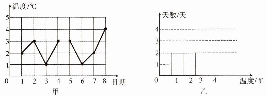 (1)在图乙中补全条形统计图;(温度3℃对应天数为3,温度4℃对应天数为1,图略)