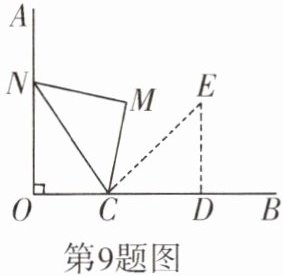 9. 如图,$OA\perp OB$,等腰直角三角形 $CDE$ 的腰 $CD$ 在 $OB$ 上,$\angle ECD = 45^{\circ}$,将三角形 $CDE$ 绕点 $C$ 逆时针旋转 $75^{\circ}$,点 $E$ 的对应点 $N$ 恰好落在 $OA$ 上,则$\frac{OC}{CD}$的值是(