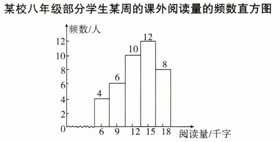 16. 为了了解八年级学生每周的课外阅读情况,某校语文组调查了该校八年级部分学生某周的课外阅读量 (精确到千字)。将调查数据经过统计整理后,得到如图的频数直方图,请根据该频数直方图,回答下列问题.