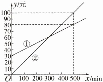 9. 某通信公司推出①②两种通信收费方式供用户选择,其中一种有月租费,另一种无月租费,且两种收费方式的收费 $ y $(元)与通信时间 $ x $($ \mathrm{min} $)之间的函数关系图象如图所示。