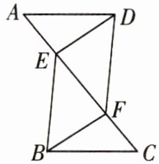 $\therefore \triangle A D F \cong \triangle C B E(A A S), \therefore B E=D F$,又$B E // D F$,$\therefore$四边形$D E B F$是平行四边形.