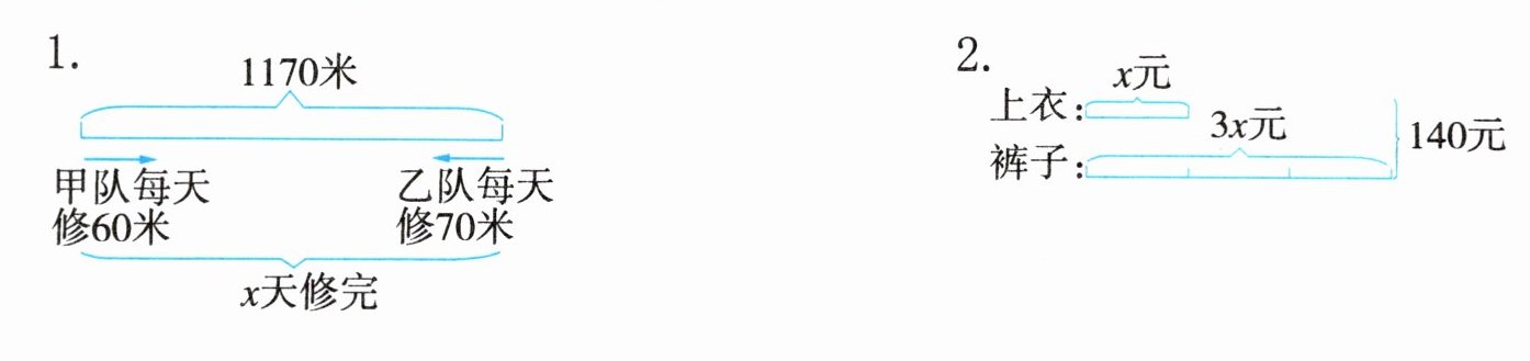 【解析】:1. 设$x$天修完,甲队每天修60米,$x$天修$60x$米,乙队每天修70米,$x$天修$70x$米,两队$x$天一共修1170米,可列方程:$60x + 70x=1170$,解得$130x = 1170$,$x = 9$。