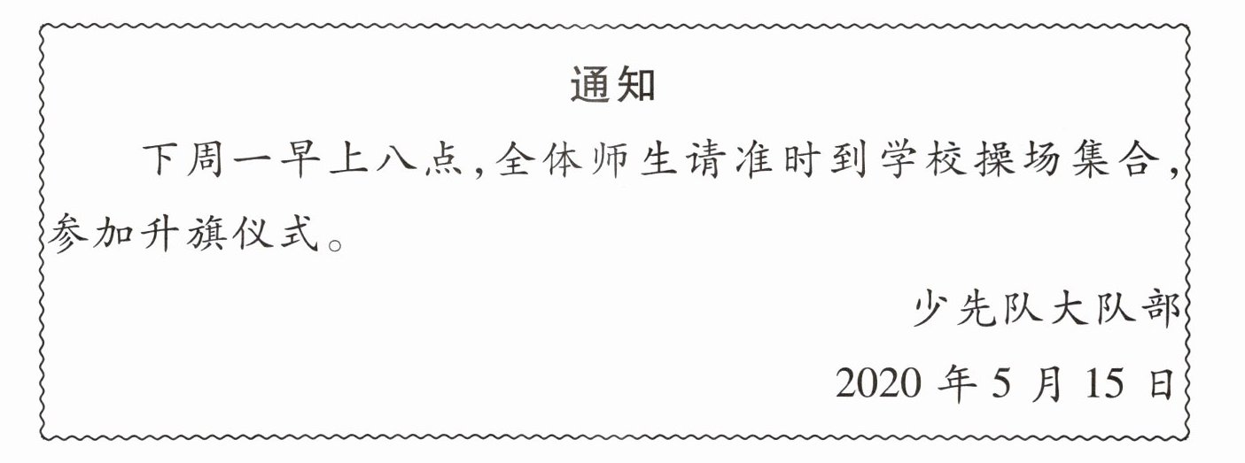 下周一早上八点 学校操场 全体师生 参加升旗仪式 少先队大队部 2020 年 5 月 15 日