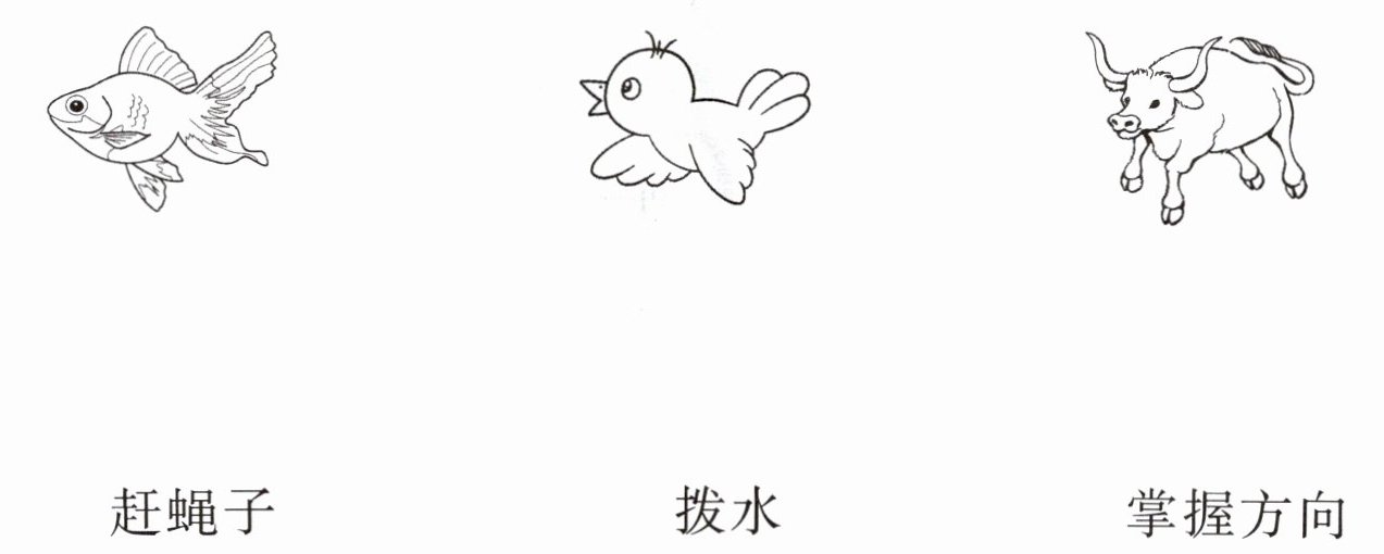 【答案】:鱼—拨水;小鸟—掌握方向;牛—赶蝇子