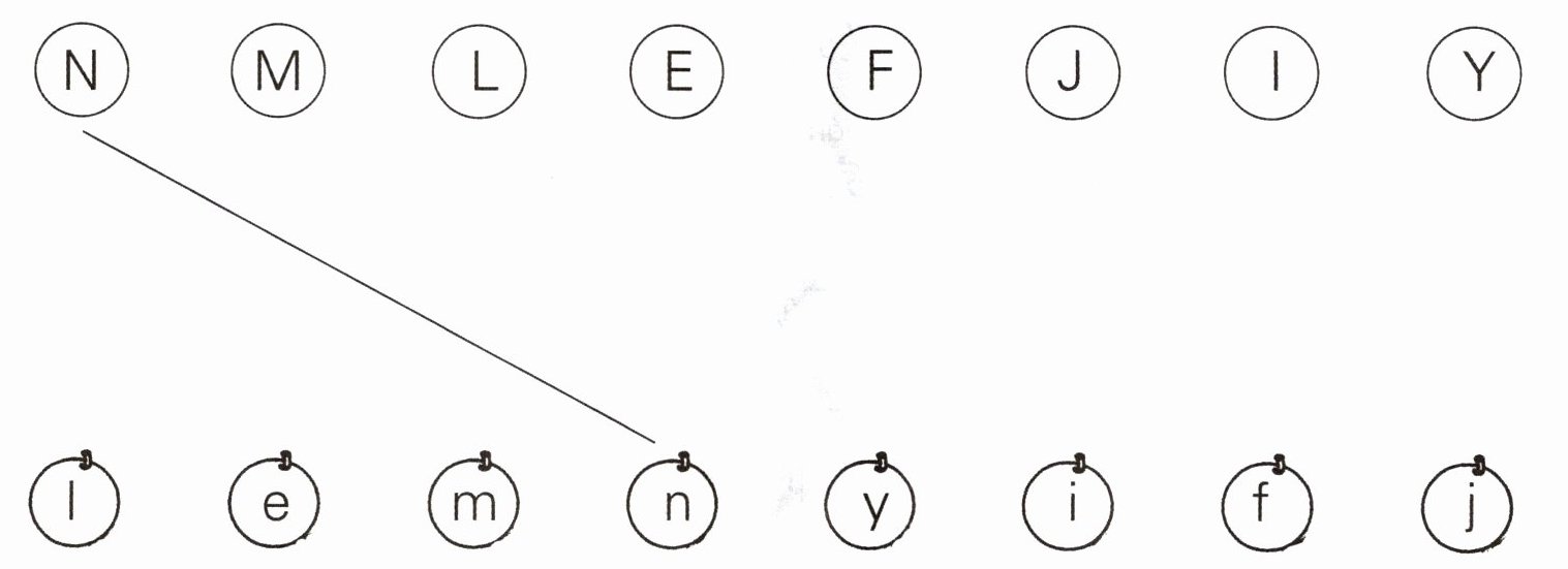 【解析】:题目要求将大写字母与对应的小写字母相连。已知“N”已与“n”相连作为示例,我们只需找出其他大写字母对应的小写字母即可。大写字母“M”对应小写“m”,“L”对应“l”,“E”对应“e”,“F”对应“f”,“J”对应“j”,“I”对应“i”,“Y”对应“y”。