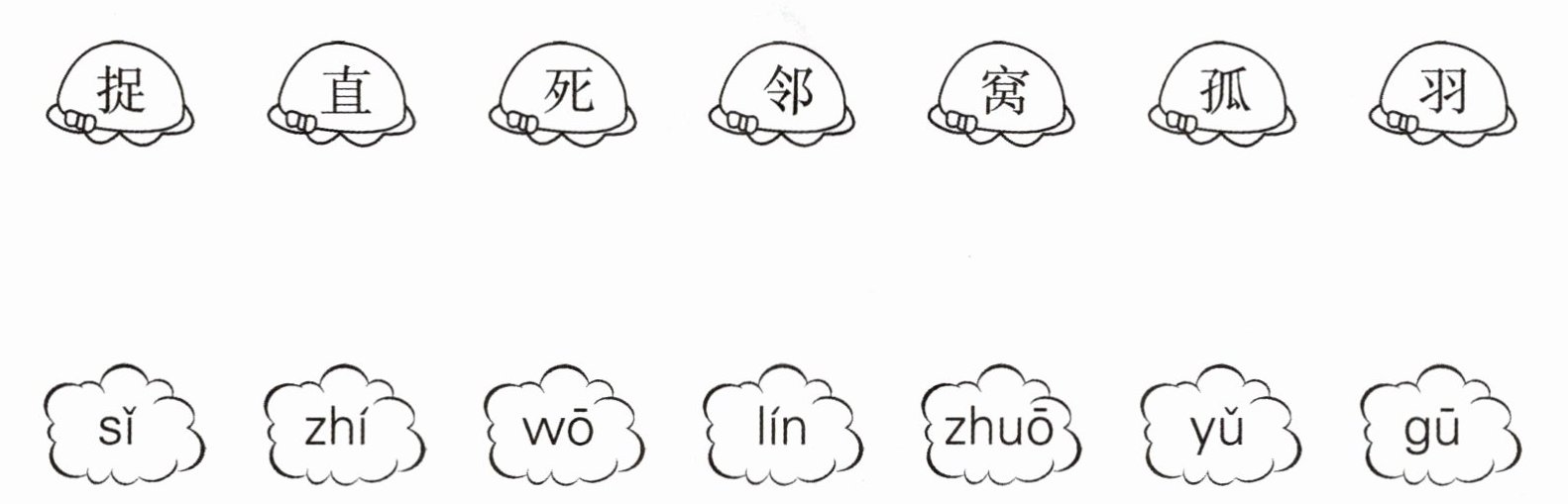 【解析】:本题考查汉字与拼音的对应能力。需要准确认读每个汉字的读音,然后与下方给出的拼音进行匹配连线。“捉”读音为“zhuō”,“直”读音为“zhí”,“死”读音为“sǐ”,“邻”读音为“lín”,“窝”读音为“wō”,“孤”读音为“gū”,“羽”读音为“yǔ”。