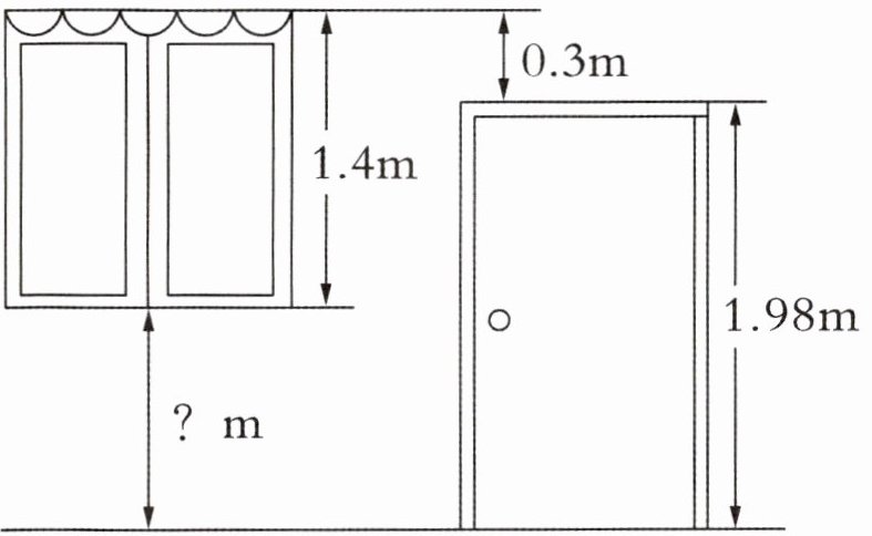 【解析】:从图中可以看出,门的高度是1.98米,门的顶部到窗户顶部的距离是0.3米,窗户自身的高度是1.4米。窗户离地面的高度等于门的高度加上门顶部到窗户顶部的距离,再减去窗户的高度,即$1.98 + 0.3 - 1.4$