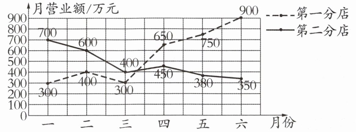 三、下图是某超市第一分店、第二分店的一月至六月月营业额统计图。