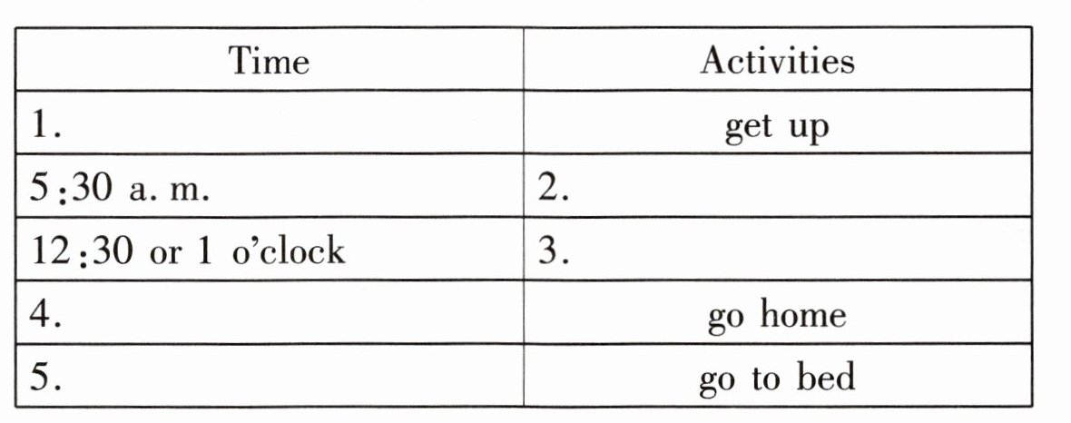 4:50 a. m. 2. go to work 3. eat lunch 4. 9:00 p. m. 5. 10:20 p. m.