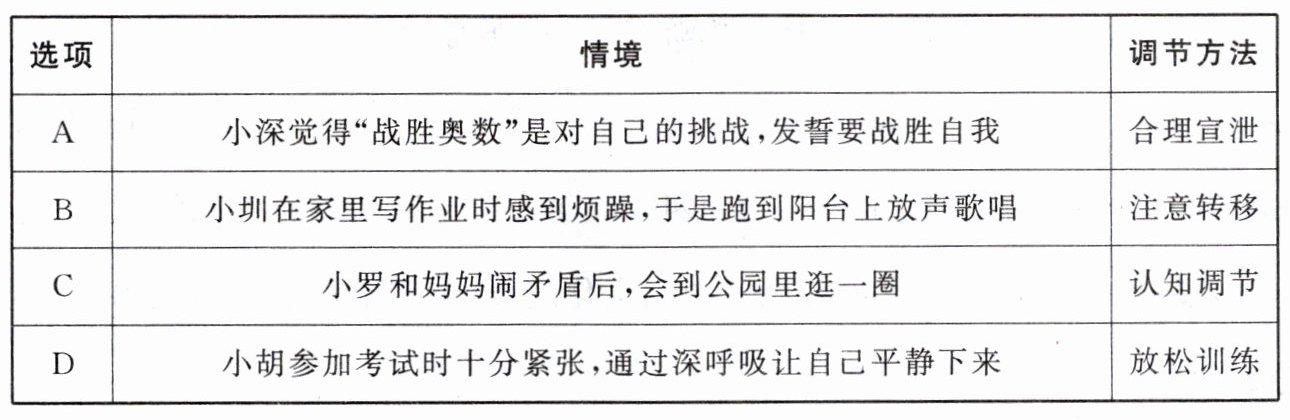 4. 下列生活情境中,同学们调节情绪的方法,正确的是(