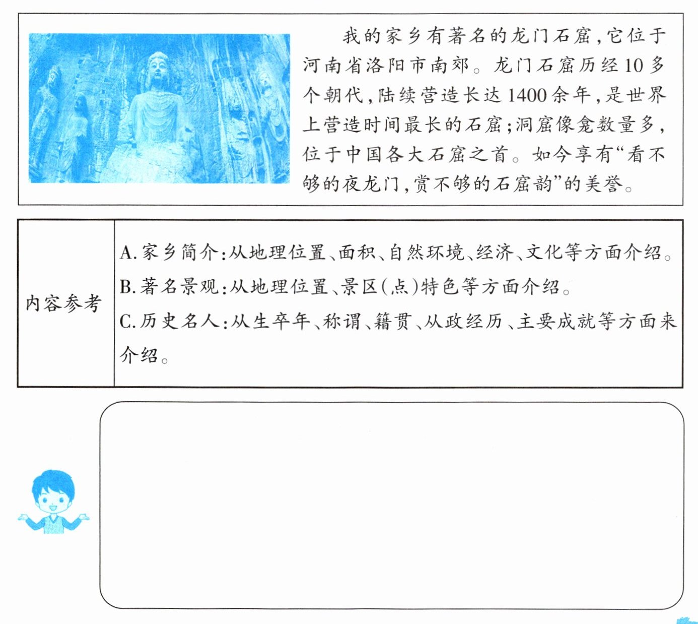 2. 下面是小洛同学做的一张以家乡著名景观为内容的宣传名片。请你选择一个方面,也为自己的家乡做一张名片。