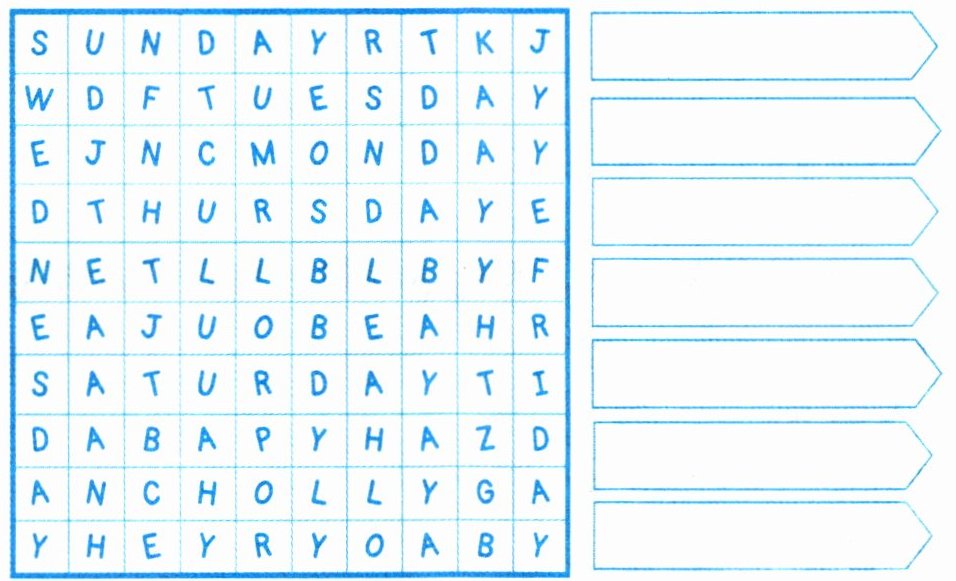 【解析】:在字母迷宫中,按从左到右的顺序查找:第一行可找到“Sunday”;第二行能找到“Tuesday”;第三行有“Monday”;第四行是“Thursday”;第七行存在“Saturday”。还缺少“Wednesday”和“Friday”,在迷宫中仔细寻找横向或纵向连续的字母,可发现“Wednesday”和“Friday”也能找到。一周七天的正确顺序是Sunday, Monday, Tuesday, Wednesday, Thursday, Friday, Saturday。