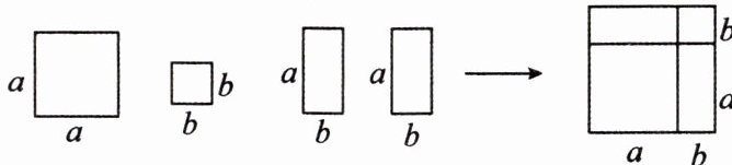1. 利用 1 个$a × a$的正方形,1 个$b × b$的正方形和 2 个$a × b$的长方形可拼成一个大正方形(如图所示),从而可得到因式分解的公式: