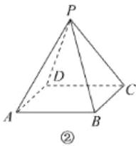 (4)成图。连接$PA$,$PB$,$PC$,$PD$,并擦去辅助线,将被遮住的部分改为虚线,即得正四棱锥的直观图,如图②所示。