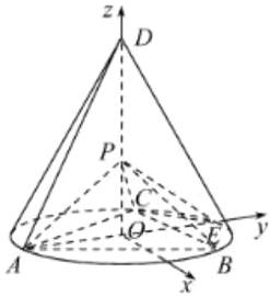 由题设可得 $ E(0,1,0) $,$ A(0, - 1,0) $,$ C\left( - \frac{\sqrt{3}}{2}, \frac{1}{2},0 \right) $,$ P\left(0,0,\frac{\sqrt{2}}{2} \right) $。