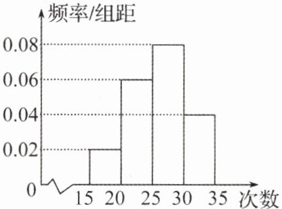 11. 为了了解某校九年级1600名学生的体能情况,随机抽查了部分学生,测试1分钟仰卧起坐的成绩(次数),将数据整理后绘制成如图所示的频率分布直方图,根据统计图的数据,下列结论错误的是 (