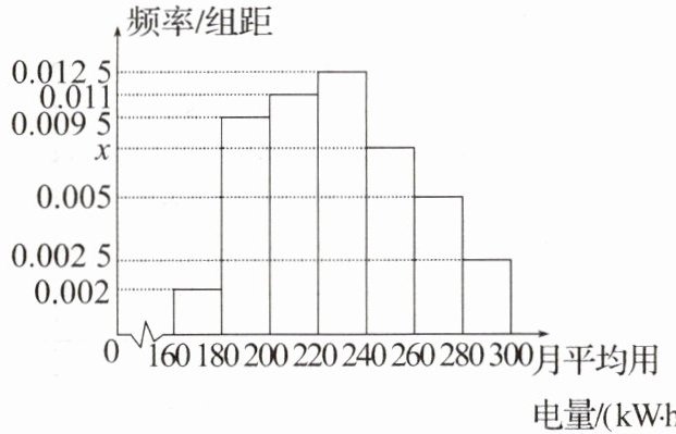 (2)由直方图知:月平均用电量的众数是$\frac{220 + 240}{2}=230$。因为$(0.002 + 0.0095 + 0.011)×20 = 0.45<0.5$,所以月平均用电量的中位数在$[220,240)$内。设中位数为 a,由$(0.002 + 0.0095 + 0.011)×20 + 0.0125×(a - 220)=0.5$,可得$a = 224$。所以月平均用电量的中位数为 224。