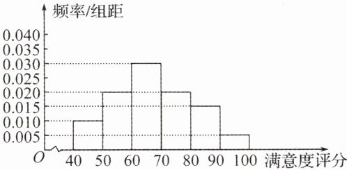 记$C_{A}$表示事件:“A 地区用户的满意度等级为不满意”;$C_{B}$表示事件:“B 地区用户的满意度等级为不满意”。由直方图得$P(C_{A})$的估计值为$(0.01 + 0.02 + 0.03)×10 = 0.6$,$P(C_{B})$的估计值为$(0.005 + 0.02)×10 = 0.25$。所以 A 地区用户的满意度等级为不满意的概率大。