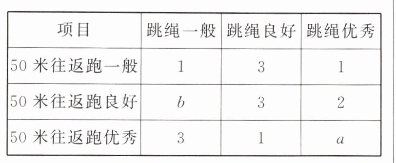 (2)根据表格,50米往返跑为优秀的学生有6人,记这6人为1,2,3,4,5,6,其中5,6表示这6人中跳绳为优秀的学生,从这6人中抽取2人的所有情况为:12,13,14,15,16,23,24,25,26,34,35,36,45,46,56,共15种情况,其中至少有一位跳绳优秀的情况有:15,16,25,26,35,36,45,46,56,共9种情况,所以其中至少有一位跳绳为优秀的学生的概率$P=\frac {9}{15}=\frac {3}{5}$.