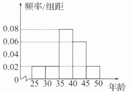 19.(17分)某单位N名员工参加“社区低碳你我他”活动,他们的年龄在25岁至50岁之间,按年龄分组:第1组$[25,30)$,第2组$[30,35)$,第3组$[35,40)$,第4组$[40,45)$,第5组$[45,50]$,得到的频率分布直方图如图所示,如表是年龄的频数分布表.