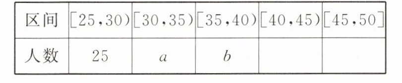 (1)由频率分布直方图可知,$[25,30)$与$[30,35)$两组的人数相同,所以$a=25$,且$b=25×\frac {0.08}{0.02}=100$,总人数$N=\frac {25}{0.02×5}=250$.