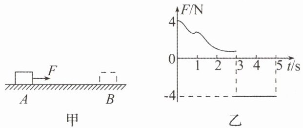 10. (20 分)如图甲所示,一质量为 $ m = 1 \mathrm { \ kg } $ 的物块静止在粗糙水平面上的 A 点,从 $ t = 0 $ 时刻开始,物块受到按如图乙所示规律变化的水平力 F 作用并向右运动,第 $ 3 \mathrm { \ s } $ 末物块运动到 B 点时速度刚好为 0,第 $ 5 \mathrm { \ s } $ 末物块刚好回到 A 点,已知物块与粗糙水平面之间的动摩擦因数 $ \mu = 0.2 $(g 取 $ 1 0 \mathrm { \ m / s ^ { 2 } } $),求: