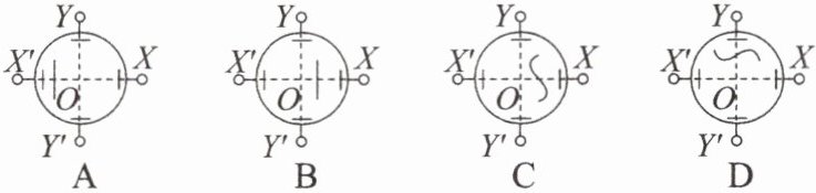 解:在电极$XX'$之间所加的电压保持不变,因此电子在X方向上的偏移位移保持不变;在电极$YY'$之间所加的电压按正弦规律变化,电子在Y方向上的偏移在正、负最大值之间变化。故荧光屏上会看到的图形是一条竖直线,选项B正确。