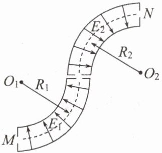 4. (2023·浙江 6 月选考)某带电粒子转向器的横截面如图所示,转向器中有辐向电场。粒子从 M 点射入,沿着由半径分别为$R_{1}和R_{2}$的圆弧平滑接成的虚线(等势线)运动,并从虚线上的 N 点射出,虚线处电场强度大小分别为$E_{1}和E_{2}$,则$R_{1}$、$R_{2}和E_{1}$、$E_{2}$应满足 (