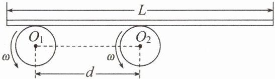 4. 如图所示,两个轮子的半径均为$ R $,两轮的转轴$ O_{1} $、$ O_{2} $在同一水平面上,相互平行,相距为$ d $,两轮均以角速度$ \omega $逆时针方向匀速转动。将一长木板置于两轮上,当木板的重心位于右轮正上方时,木板与两轮间已不再有相对滑动。若木板的长度$ L>2d $,则木板的重心由右轮正上方移到左轮正上方所需的时间是(