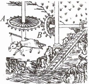 5. 如图所示为明代出版的《天工开物》一书中的牛力齿轮翻车的画面,若A、B两齿轮半径的大小关系为$ r_{A}= 1.5r_{B} $,下列说法正确的是(