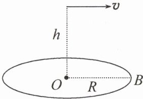 6. 如图所示,半径为$ R $的圆盘绕垂直于盘面的中心轴匀速转动,其正上方$ h 处沿 OB $方向水平抛出一小球,要使球与盘只碰一次,且落点为B,求小球的初速度大小及圆盘转动的角速度$ \omega $的大小。