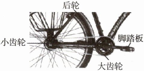 3. 某同学以“自行车的齿轮传动”作为探究学习的课题。该同学通过观察发现,自行车的大齿轮与小齿轮通过链条相连,后轮与小齿轮绕共同的轴转动。脚踏板如图所示,测得大齿轮的半径为$ r_{1} $,小齿轮的半径为$ r_{2} $,自行车后轮的半径为$ R $。若测得在时间$ t 内大齿轮转动的圈数为 N $,则自行车前进的速度大小表达式为(