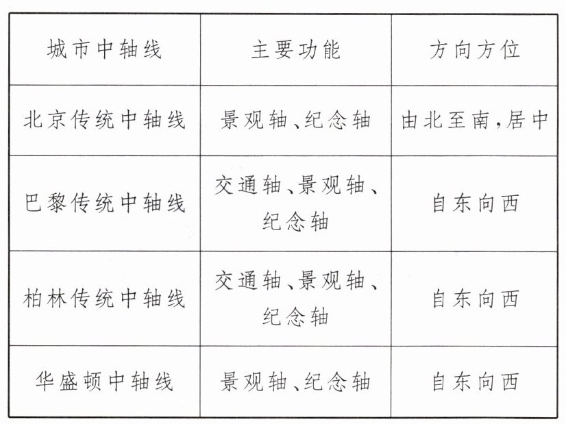 【解析】:9. 题目考查华盛顿中轴线的功能分布。根据表格,华盛顿中轴线主要功能为景观轴、纪念轴。A选项中商业广场主要体现经济功能,不符合;B选项交通枢纽站对应交通轴功能,华盛顿无此功能;C选项金融办公区为经济功能,不符合;D选项行政机构和标志性纪念碑符合景观、纪念功能,所以选D。