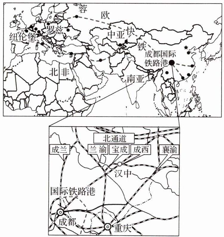 材料 成都位于成都平原、长江经济地带的西端,是我国中西部地区经济总量最大的副省级城市。“蓉欧快铁”从成都至波兰罗兹,是连接欧亚大陆,串联中国西部、欧洲及俄罗斯,辐射长三角、珠三角广大地区的经贸“大动脉”(如图所示)。早期“蓉欧快铁”全程需时14天,目前已经降至10天左右,随着秦岭高铁隧道群的贯通,未来提速指日可待。