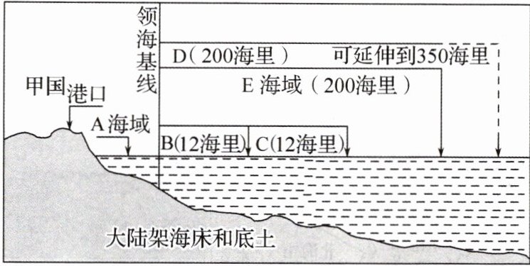 【解析】:第1题,根据《联合国海洋法公约》,领海是从领海基线量起向海洋延伸12海里的海域(图中B海域);毗连区是从领海基线量起不超过24海里的海域,即领海之外再延伸12海里(图中C海域);专属经济区是从领海基线量起不超过200海里的海域(图中E海域);大陆架是领海以外依本国陆地领土的全部自然延伸,扩展到大陆边外缘的海底区域的海床和底土,若自然延伸不足200海里,则扩展至200海里,若超过200海里,在符合一定条件下可延伸至350海里(图中D海域涉及大陆架范围)。因此C海域为毗连区,B正确。