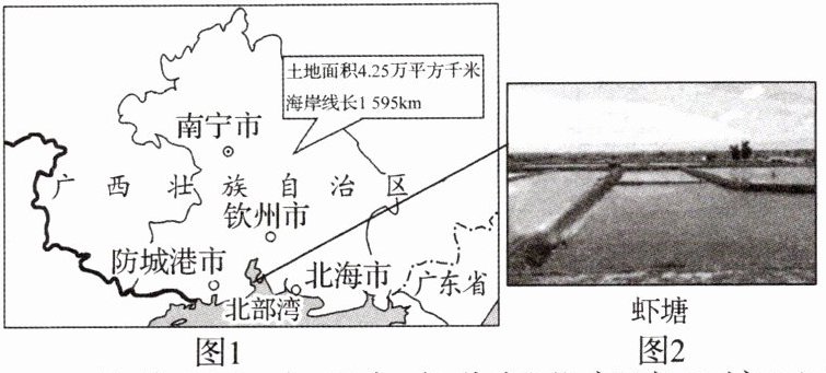 材料三 近年来在北部湾北侧海岸带出现大规模开挖鱼塘、虾塘(图2),发展养殖业的现象。