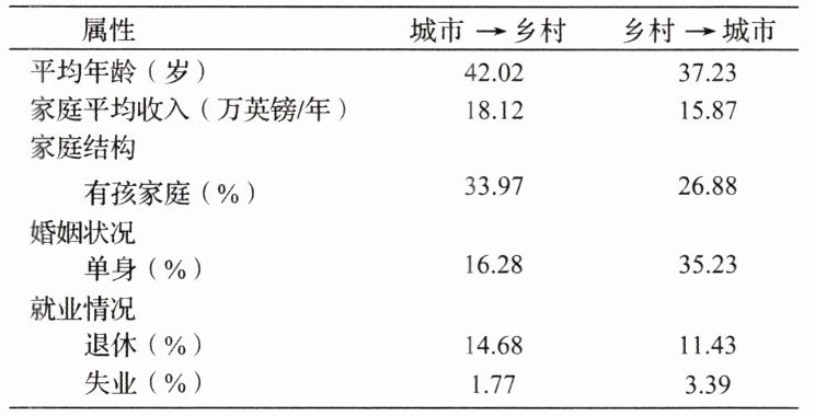 【解析】:第3题,根据表格数据,城市→乡村迁移人口的平均年龄为42.02岁,乡村→城市为37.23岁,说明迁往乡村人群平均年龄更高,D错误;失业人群在乡村→城市迁移中占比3.39%,高于城市→乡村的1.77%,因此失业人群更倾向于迁往城市,B错误;单身人群在乡村→城市迁移中占比35.23%,远高于城市→乡村的16.28%,说明单身人群更倾向于迁往城市,C正确;表格未直接给出迁移人口数量,无法判断乡村向城市迁移人口是否更多,A错误。第4题,英国有孩家庭更倾向于迁往乡村,主要因为乡村自然环境优美,适合孩子成长,①正确;城市经济发展机会更多,②错误;乡村住房价格相对较低,性价比高,③正确;城市医疗保障条件通常更好,④错误。综上,A正确。