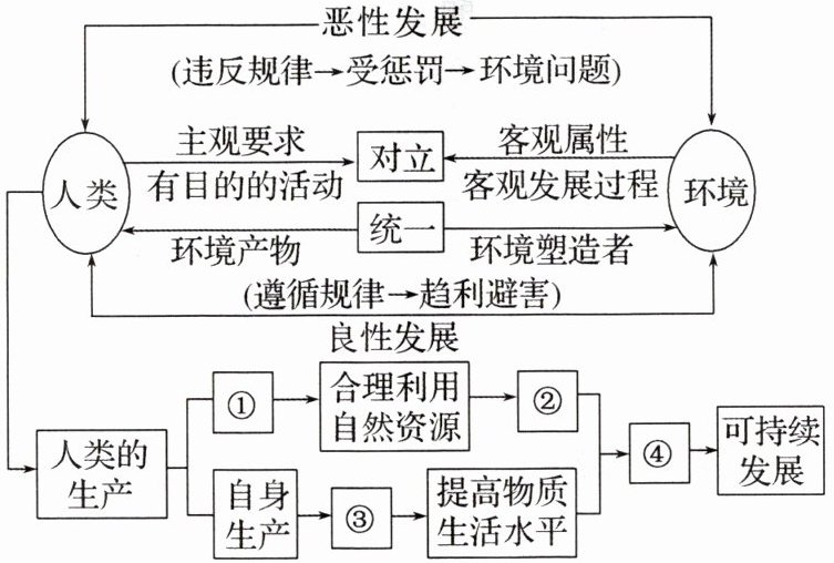 【解析】:14. 从图中“人类的生产”分为“①”和“自身生产”两个方向。“①”指向“合理利用自然资源”,合理利用自然资源后,其结果应该是改善环境质量,这样才能为可持续发展奠定基础,所以②处应是改善环境质量,A正确;人类与环境统一是人类与环境关系的整体体现,不是合理利用自然资源直接产生的结果,B错误;控制人口数量、提高人口素质属于“自身生产”相关的内容,与①合理利用自然资源的后续结果无关,C错误;物质资料生产属于人类生产的范畴,是①之前的环节,D错误。