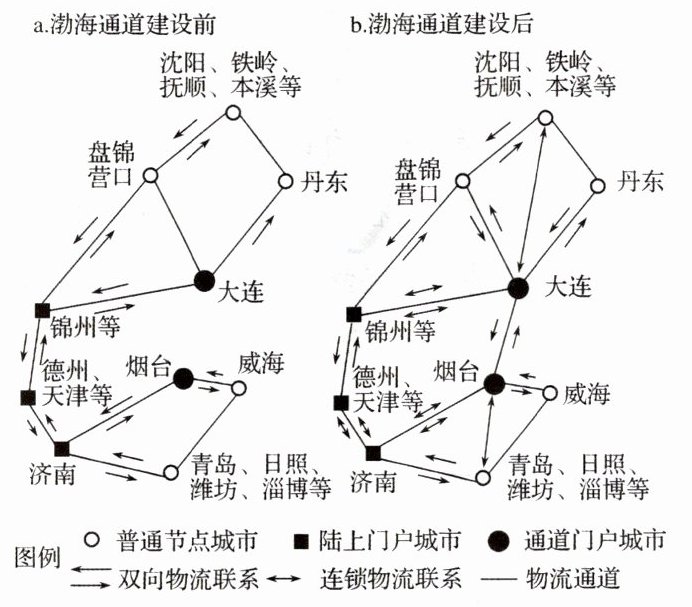 渤海海峡跨海通道是超大规模的基础设施建设工程,计划从山东烟台至辽宁大连,以跨海桥梁、海底隧道或桥梁隧道结合的方式建设直达快捷通道,对联通的山东半岛与辽中南两大区际城市群发展具有重要意义。图中(a)(b)分别表示渤海海峡跨海通道建设前、后区际城市群的物流联系通道。完成 12、13 题。