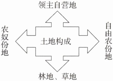 【解析】:示意图中“领主自营地”“农奴份地”“自由农份地”以及“林地、草地”的土地构成是中世纪庄园的典型特征。中世纪庄园是一个独立的自给自足的经济和政治单位,土地分为领主自营地和佃农份地,佃农包括农奴和自由农,庄园内还有共有的林地、草地等。原始农耕聚落主要是简单的农业聚居,没有领主与农奴的等级划分;中世纪城市以手工业和商业为主,土地构成与此不同;豪强地主田庄虽然也有土地划分,但“农奴”这一表述更符合中世纪欧洲的庄园特征,而非中国古代的豪强地主田庄。综上,该示意图反映的是中世纪庄园。