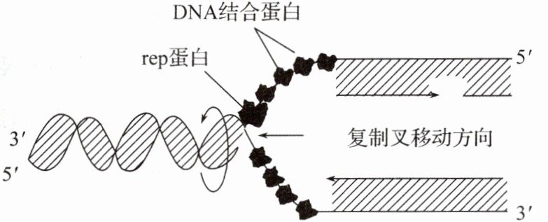 A 根据rep蛋白的功能可推断出,rep蛋白能破坏A与T、C与G之间形成的氢键,A错误;DNA结合蛋白缠绕在DNA单链上,可防止单链重新形成双链,B正确;DNA复制具有边解旋边复制和半保留复制的特点,C正确;正常情况下,一个DNA分子复制结束后可形成两个完全相同的DNA分子,D正确。