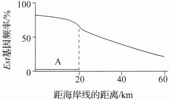 9. (2024·河北高考)地中海沿岸某陆地区域为控制蚊子的数量,每年在距海岸线 0~20 km 范围内(区域 A)喷洒杀虫剂。某种蚊子的 Est 基因与毒素降解相关,其基因频率如图所示。下列分析正确的是 (
