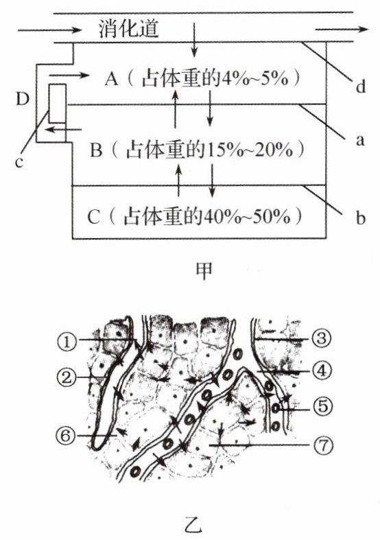 (填字母和名称)结构转移。(2)图乙中⑦内的液体约占人体体液的