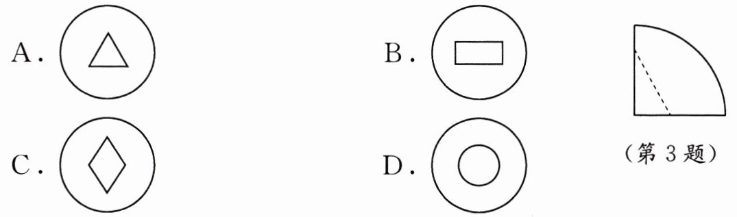 3. 将一圆形纸片对折后再对折得到如图所示的扇形,然后沿着图中的虚线剪开,得到两部分,其中一部分展开后的平面图形是( )。
